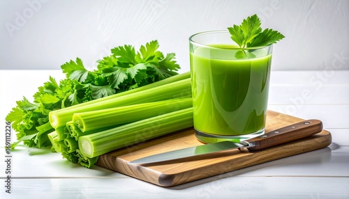 a glass of green celery juice with celery stalks and leaves beside it. A knife rests on a wooden cutting board