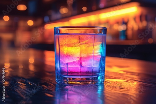 A Glass of Ice Water With Colorful Reflections on a Bar Counter