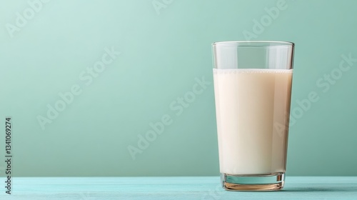 A glass of milk is elegantly positioned on a teal surface, with soft lighting creating a serene and soothing ambiance, perfect for capturing the essence of refreshment.