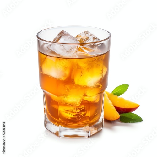 a glass of peach tea with ice cubes, studio light , isolated on white background