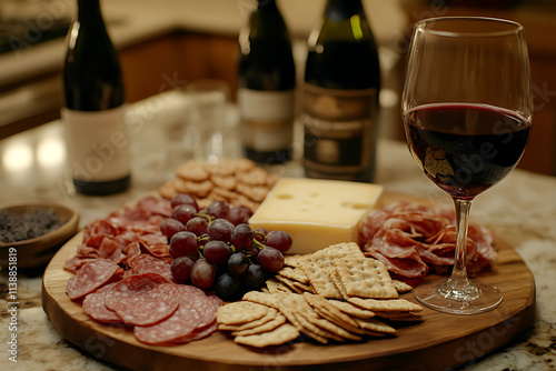 A Glass of Red Wine Next to a Charcuterie Board with Cheese and Meats.