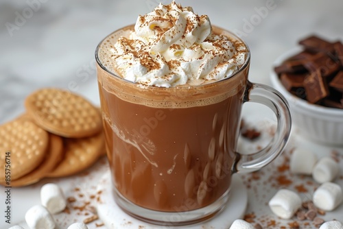 A glass of rich hot chocolate topped with whipped cream and marshmallows.