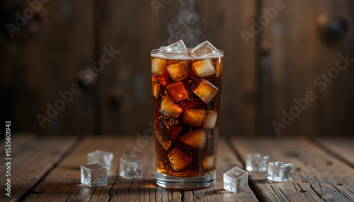 A glass of soda with ice cubes in it. The ice cubes are melting, and the soda is steaming