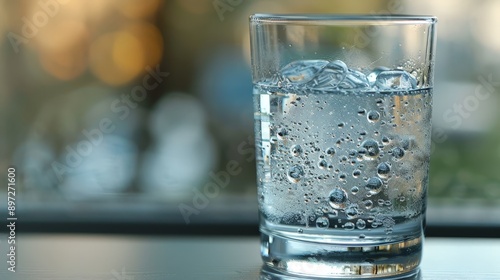 A glass of water with condensation, placed on a windowsill