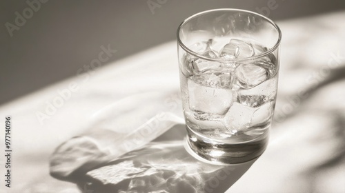 A glass of water with ice cubes, placed on a bright white background, casting a soft shadow.