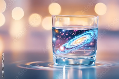 A glass of water with the universe inside, galaxies swirling within it