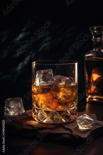 A glass of whiskey on a dark background with ice cubes in a luxury style. Generative AI