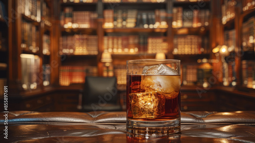 A glass of whiskey with ice cubes in a luxurious library setting.