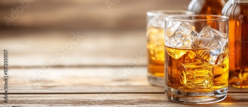 A glass of whiskey with ice cubes next to a bottle of whiskey
