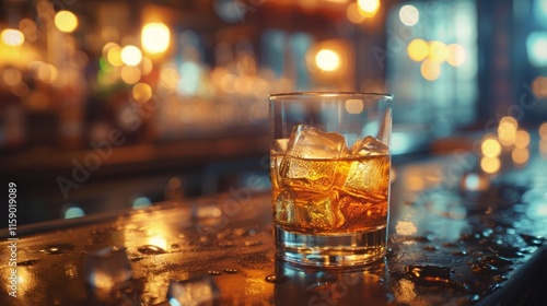A glass of whiskey with ice on a bar, bathed in warm light, exudes a calm and cozy vibe, evoking solitude and reflection in a peaceful setting.