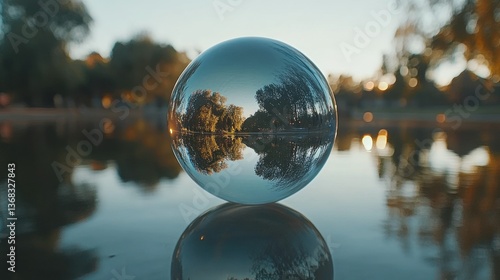 A glass orb reflecting trees and a lake during golden hour