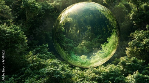 A glass sphere rests amidst a verdant forest, its surface reflecting the surrounding trees and foliage, creating a mesmerizing illusion of a world within a world. This image symbolizes the interconnec