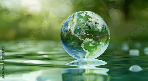 A glass sphere with the Earth inside, floating on water, symbolizing global environmental protection
