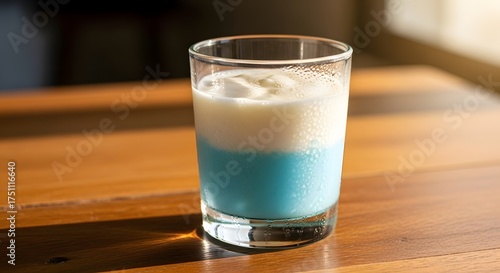 A glass with a blue and white layered drink sitting on a wooden table in a brightly lit room