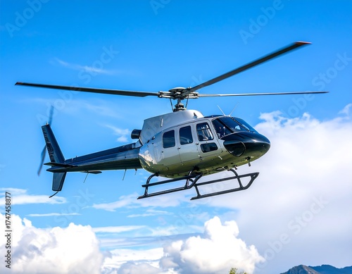 A gleaming silver helicopter is in mid-air against a vibrant blue sky, its blades a blur of motion, clouds surrounding it