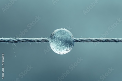 A glistening, textured sphere, likely ice or water, sits perfectly centered on a fibrous rope against a serene teal background.