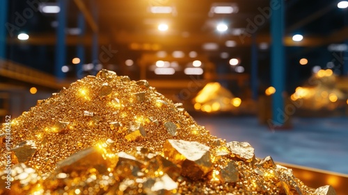 A glittering pile of gold nuggets and bars glimmers in a well-lit warehouse, showcasing wealth and luxury.