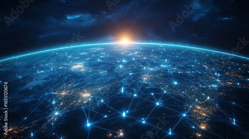 A global digital network spanning the entire planet, with luminous blue streams of light representing connections and the flow of information