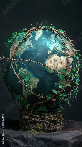 A globe encircled by thorny vines, symbolizing environmental challenges and the Earth's fragility on a dark background.
