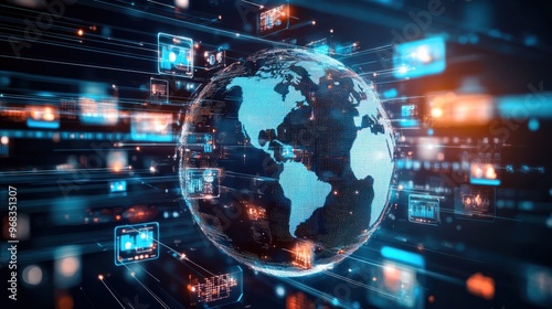 A globe surrounded by digital icons, representing international outsourcing networks.