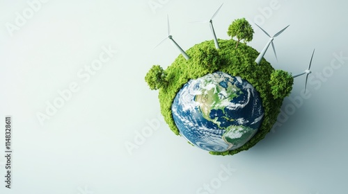 A globe surrounded by greenery and wind turbines symbolizes environmental sustainability. Save the planet concept.