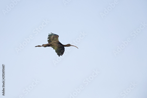 A glossy ibis (Plegadis falcinellus) banking and starting to land on one of the rice paddy fields in Portugal.