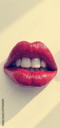 A glossy, vibrant red lip set against a minimalist white backgroundsleek and sensual with sharp teeth peeking through in perfect symmetry.