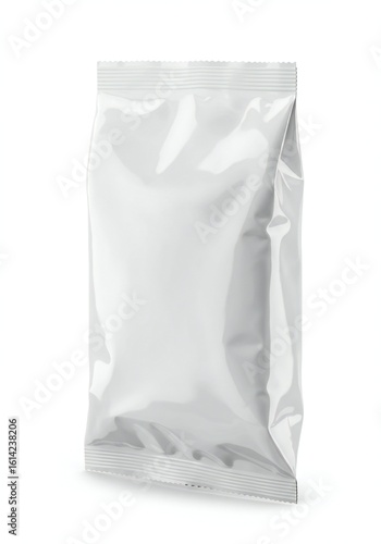 A glossy white packaging bag, smooth and empty, is centered in the frame against a bright, neutral backdrop. The focus is on the bag's subtle curves and reflective surface