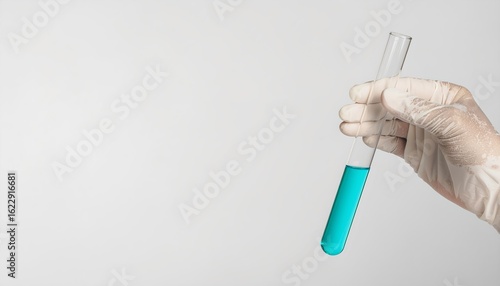 A Gloved Hand Holding a Test Tube Filled with Vibrant color Liquid Against a Plain Light Gray Background, Representing Scientific Research and Laboratory Experimentation in a Clean and Controlled