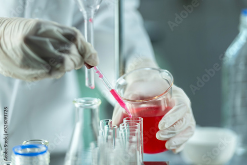 A gloved scientist carefullyDi Ding s a red liquid from a burette into a beaker.