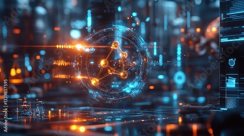 A glowing 3D molecular structure rotating in a futuristic research lab, vibrant and precise