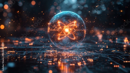 A glowing atom sphere, suspended over a circuit board. Dynamic lighting and bokeh effect enhance the scientific theme