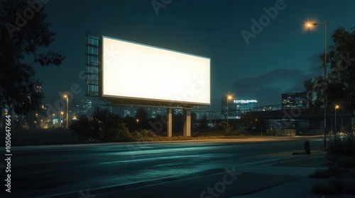 A glowing billboard mockup stands out at night, surrounded by modern buildings and soft lights