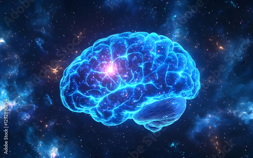 A glowing blue brain in a cosmic background, symbolizing intelligence, creativity, and the universe's mysteries.