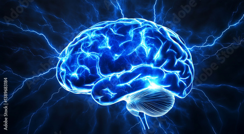 A glowing blue brain surrounded by lightning bolts against a black background.
