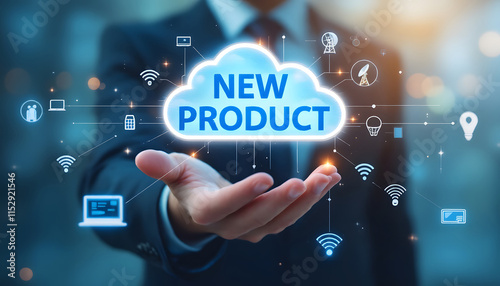 A glowing blue cloud labeled "NEW PRODUCT" hovers above a hand, surrounded by futuristic icons representing technology, innovation, and connectivity.