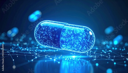 A glowing blue digital capsule floats above a network of connected nodes, symbolizing futuristic medicine and technology integration in healthcare.
