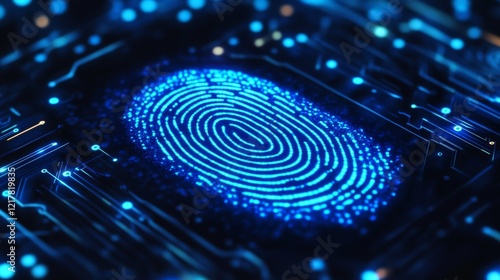 A glowing blue digital fingerprint on a complex electronic circuit board, symbolizing identity, security, and the intersection of technology and personal data in modern times.