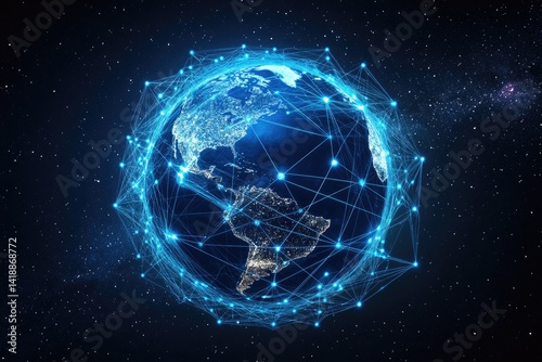 A glowing blue Earth with a network of lines and dots, surrounded by stars