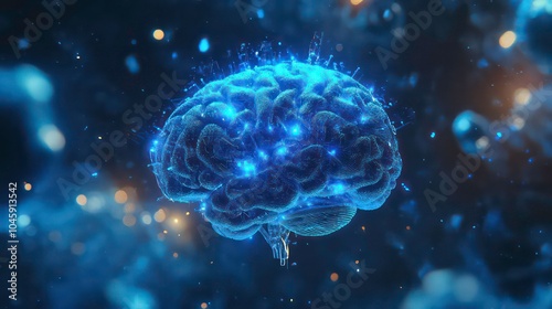 A glowing blue human brain with sparks and blue lights floating in a dark blue background with out of focus lights.