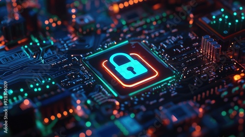 A glowing blue padlock icon surrounded by an orange frame is displayed on a circuit board with glowing green and orange lines.