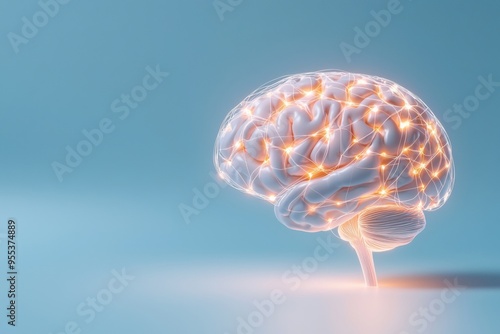 A glowing brain illustration symbolizing intelligence, creativity, and cognitive processes on a soft blue background.