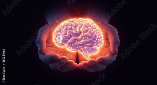 A glowing brain image, gently held within two hands, evokes a sense of protection and care for cognitive well-being.