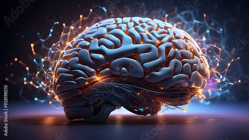 A glowing brain that displays data processing and computer intelligence through swirling patterns. The idea of brainpower.
