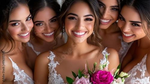A glowing bride stands surrounded by her bridesmaids, all sharing radiant smiles. The group exudes joy and closeness, with the bride holding a vibrant bouquet, highlighting the love