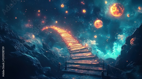 A glowing bridge spanning a vast, otherworldly chasm with floating orbs of light