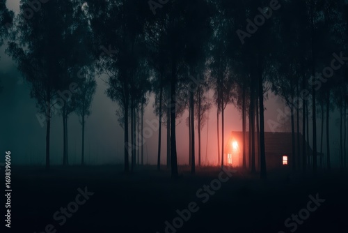 A glowing cabin stands in a dark, misty forest at night, with tall trees silhouetted against the eerie, atmospheric light