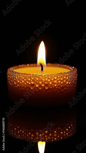 A glowing candle with a vibrant flame and dewdrops on its surface, reflecting beautifully against a dark background, creating a warm ambiance.