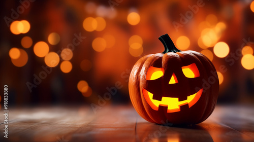A glowing, carved pumpkin sits on a wooden table, radiating warmth and joy, surrounded by soft, colorful bokeh lights typical of Halloween celebrations, copy space