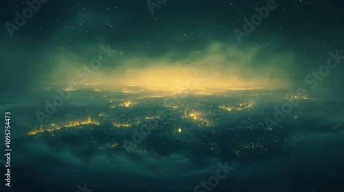 A glowing cityscape shrouded in mist and clouds, evoking a sense of mystery and wonder.